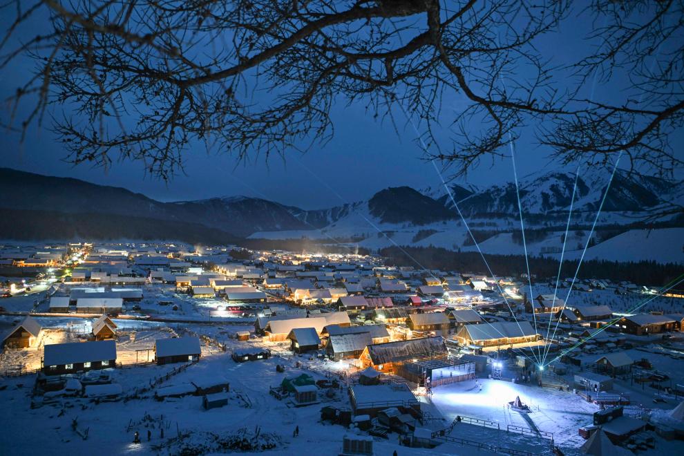 夕阳沉入西边山峦,夜幕降临,延绵雪峰下,禾木村被暖色灯光照亮,分外迷人。座座小木屋内,欢笑声中流露出冰雪旅游的热气,升腾不息。
