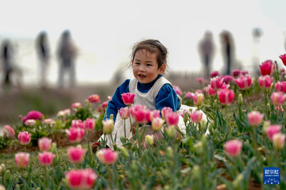 2月26日,一名小朋友在滇池边一处郁金香花丛旁拍照。新华社记者 陈欣波 摄