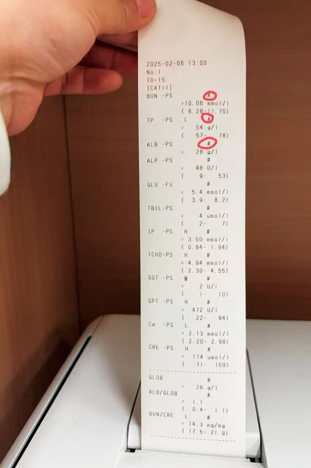 一位宠物主人提供的生化检查单,画圈处为生化试剂过期警示符号。受访者供图