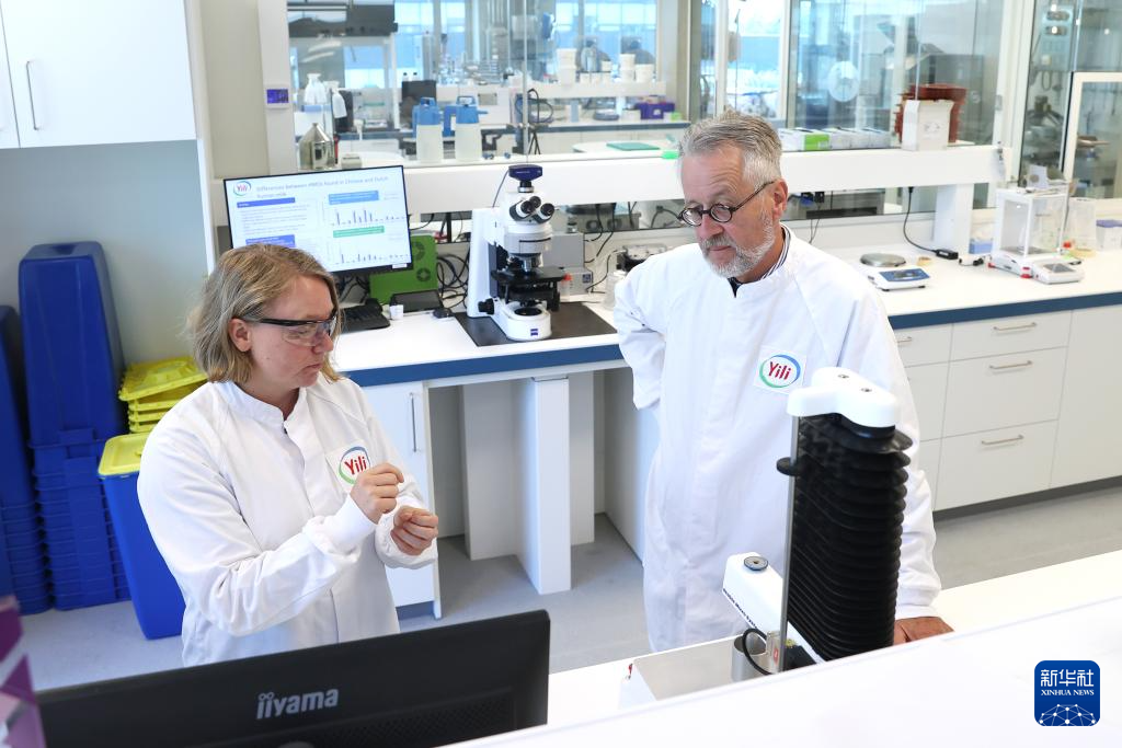 6月19日,荷兰专家赫里特·斯米特博士(右)与同事在位于荷兰瓦赫宁根的伊利欧洲创新中心工作。新华社记者 赵丁喆 摄