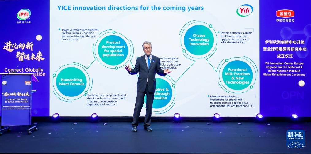 2024年4月18日,在荷兰瓦赫宁根,荷兰专家赫里特·斯米特博士在伊利欧洲创新中心升级暨全球母婴营养研究中心成立仪式上发表演讲(资料照片)。新华社发(伊利供图)
