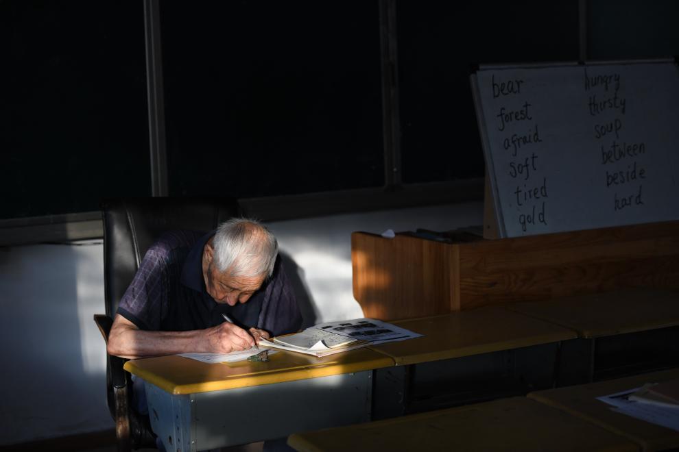 在英语课上,老人发音标准、思维清晰、板书工整,孩子们听课时也十分专注。