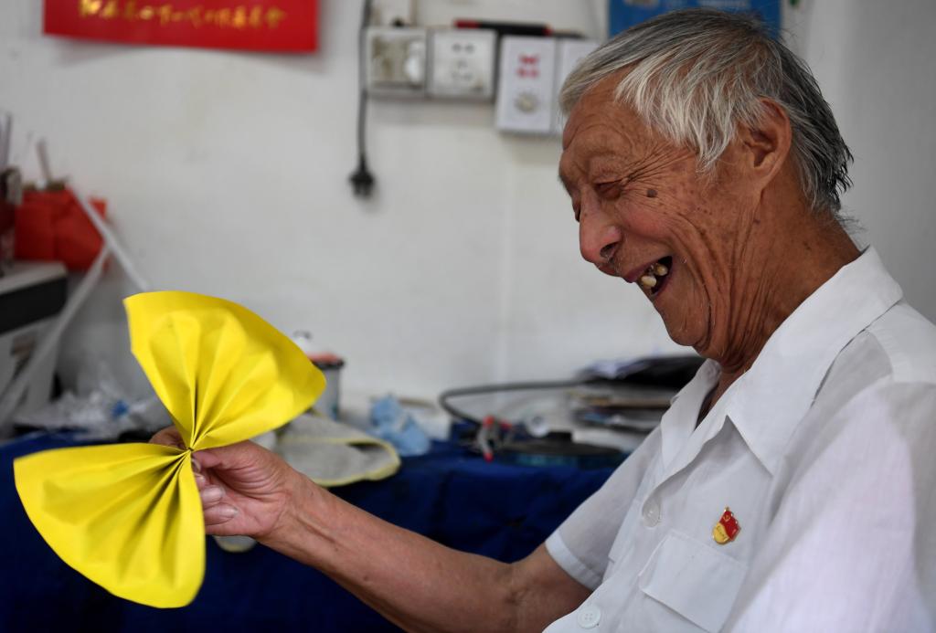 2019年7月31日,叶连平在“留守未成年人之家”教室里欣赏学生刚刚送给自己的折纸礼物。新华社记者 刘军喜 摄