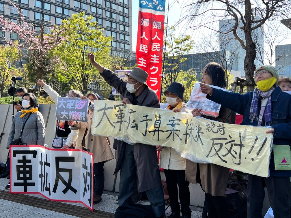 2023年3月28日,在日本东京,民众在参议院议员会馆前举行抗议活动,反对参议院当天通过“军备扩张预算”案。新华社记者姜俏梅摄