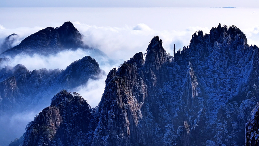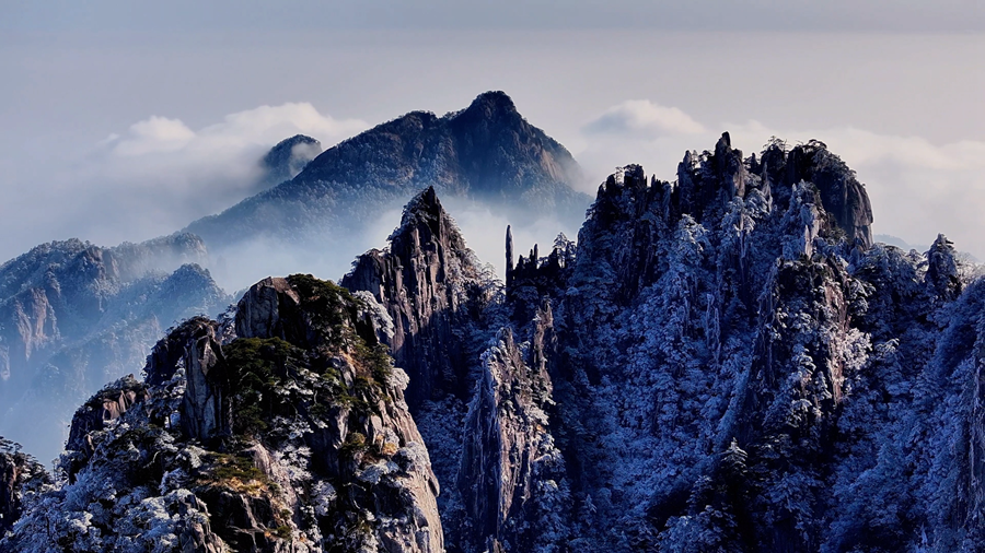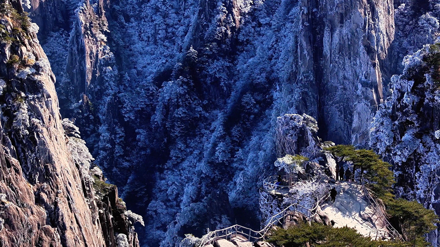 日前,黄山之巅迎来雾凇美景,奇松怪石、千峰万壑,被细腻晶莹的冰凌包裹,仿佛是大自然用银色的画笔将黄山描绘成水晶画卷,静谧壮丽、令人沉醉。(丁家庆)