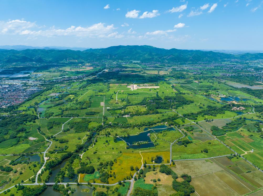 这是2024年7月4日拍摄的杭州良渚古城遗址公园全景(无人机照片)。 新华社记者 江汉 摄