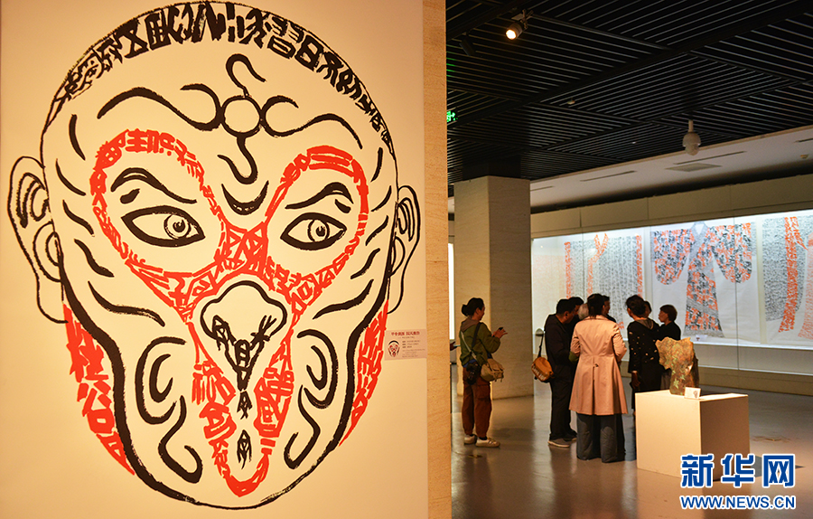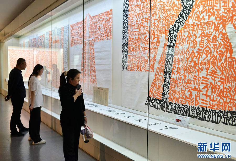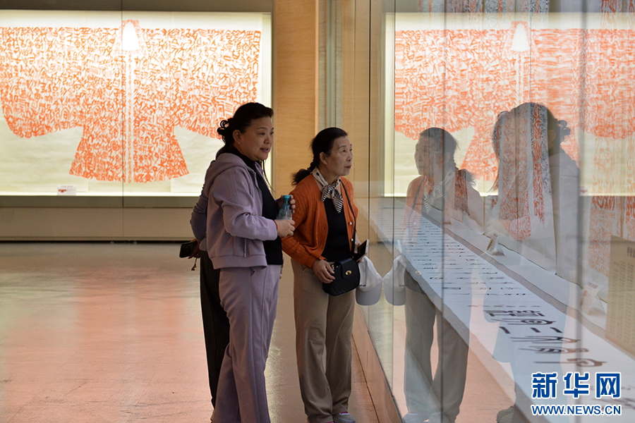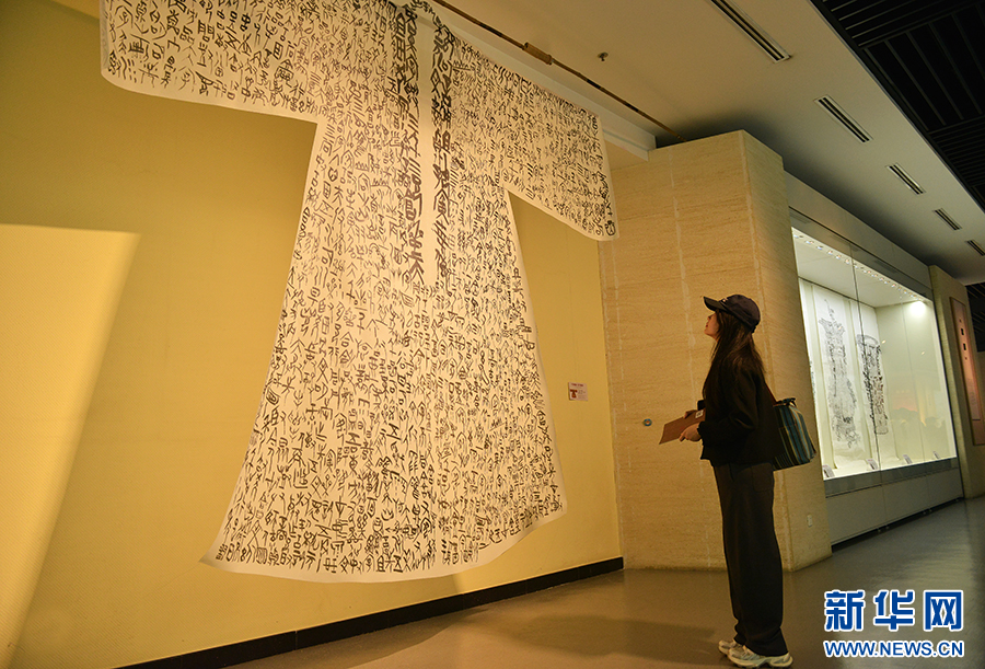 4月21日,在中国文字博物馆,游客在观赏展出的作品。