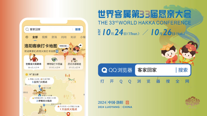 为了让更多客家人参与大会,腾讯QQ浏览器推出“世客会火炬打卡地图”和“全世界客家人回洛恳亲打卡”活动,不能亲临现场的客亲可通过三种方式线上“打卡回家”,云游洛阳。
