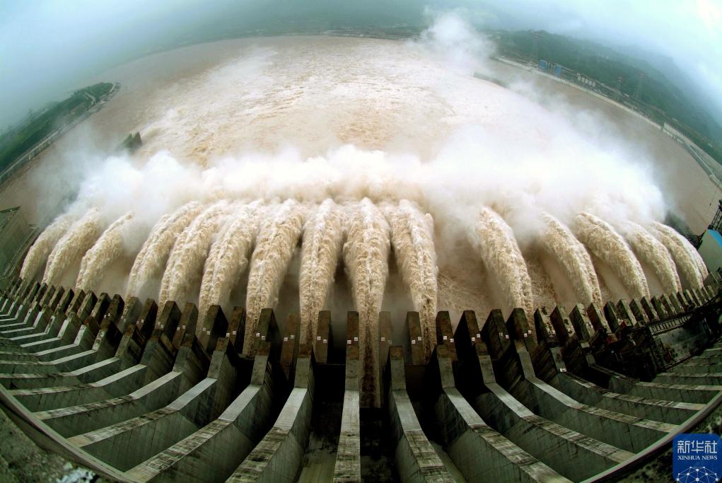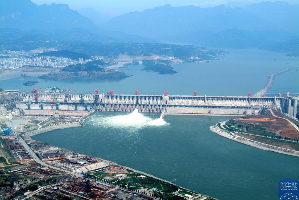 江水从大坝泄洪坝的泄洪深孔奔腾而出,尽显动感和力量。