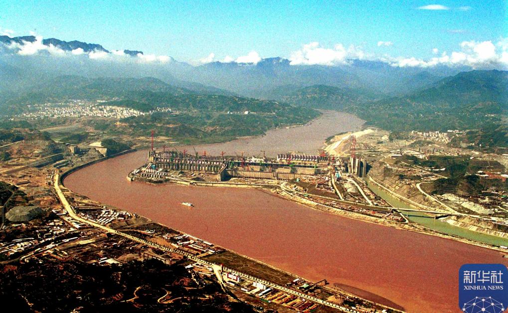 中堡岛已经消失,三峡左岸大坝初具雏形(2001年11月摄)。