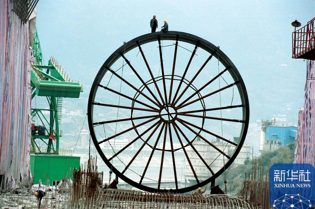 三峡大坝左岸电站压力引水管正在安装(1999年8月摄)。