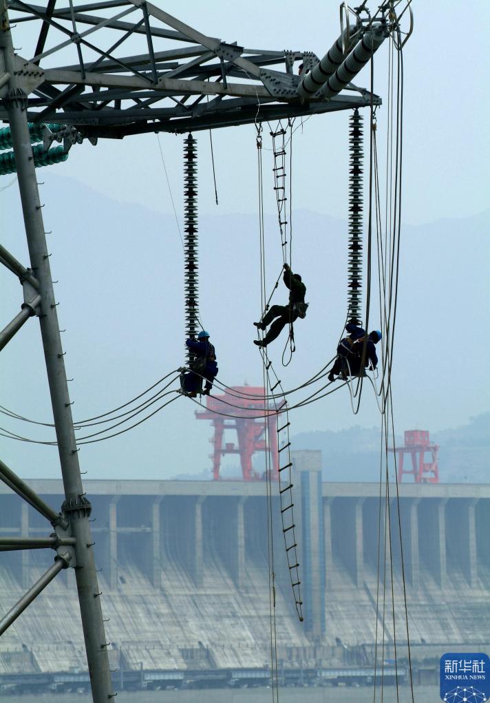 2007年5月25日,建设者在架设三峡右岸电站电力输送线路。