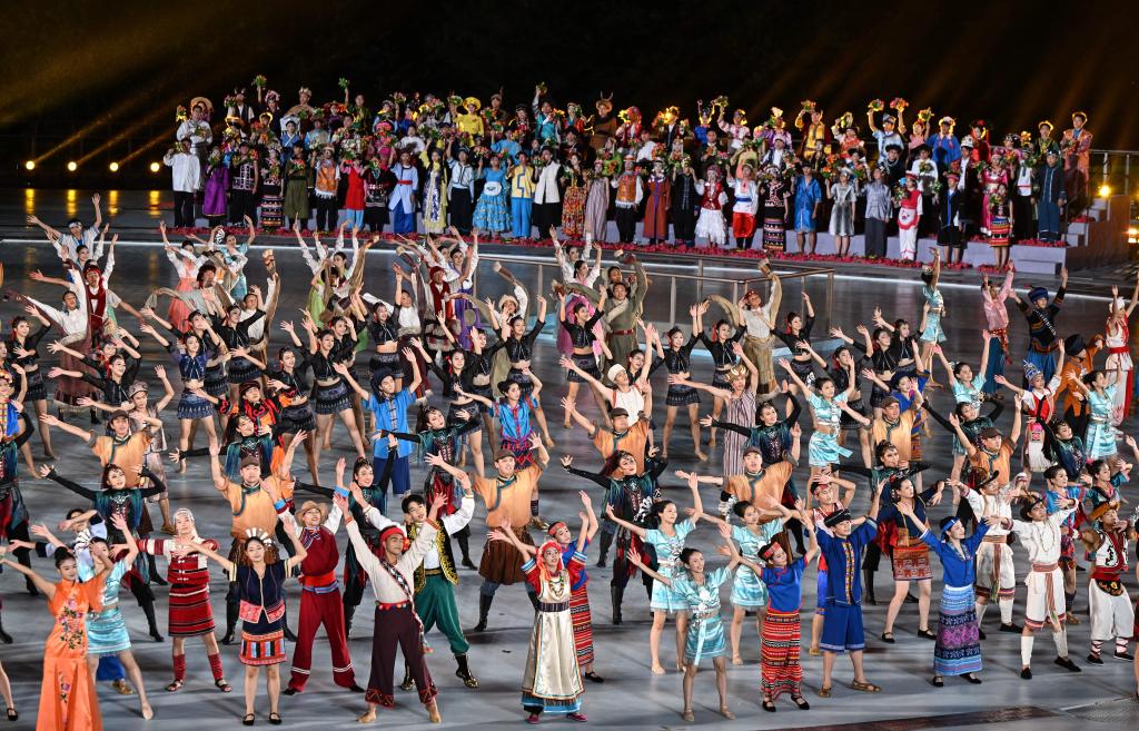 夜色渐深,大联欢进入尾声,伴随着欢快的音乐声,演员们热情地邀请运动员们一起歌唱、一起舞蹈,欢快热烈的气氛一直延续,团结友爱的情绪也如同海浪一般蔓延。