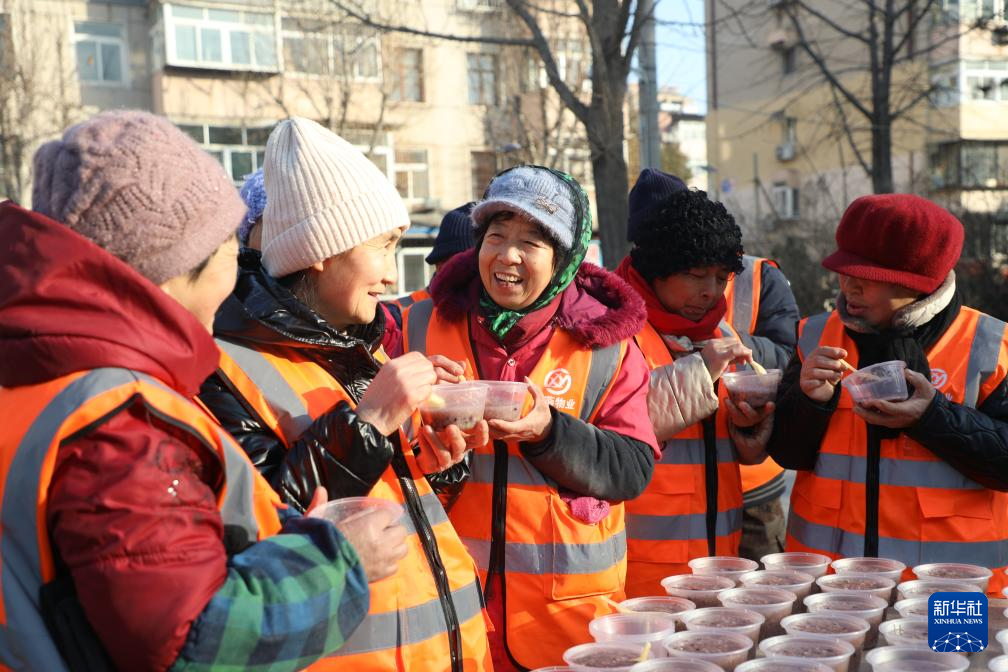 1月25日,在河北省唐山市丰润区燕山路街道欣园社区,环卫工人品尝志愿者送来的腊八粥。新华社发(朱大勇摄)