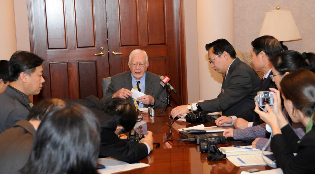 2008年12月7日,在美国亚特兰大市,美国前总统卡特(中)接受中国媒体采访。新华社发
