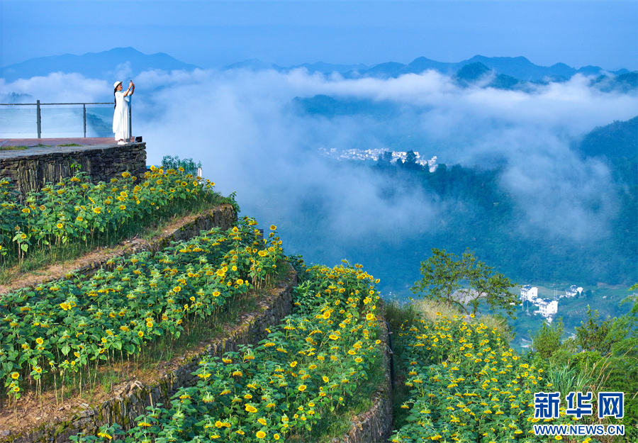 当日,雨后初霁的安徽省黄山市歙县霞坑镇石潭古村云海飘荡,盛开的向日葵和徽派民居遥相呼应,如诗如画,吸引众多游客前来游玩。新华网发(施亚磊 摄)