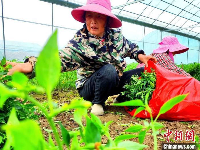 图为安福县洲湖镇毛田村的果蔬种植基地,农户正在采摘辣椒幼苗。郑景林 摄