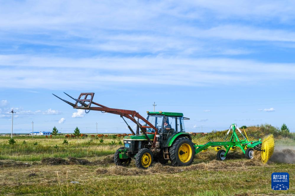 8月26日,在内蒙古呼伦贝尔市鄂温克族自治旗,牧民驾驶割草机收割牧草。