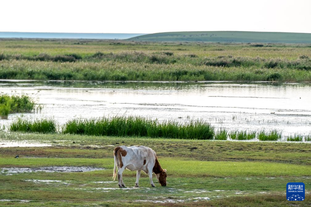 8月26日,在内蒙古呼伦贝尔市鄂温克族自治旗辉河湿地,牛在草原上吃草。