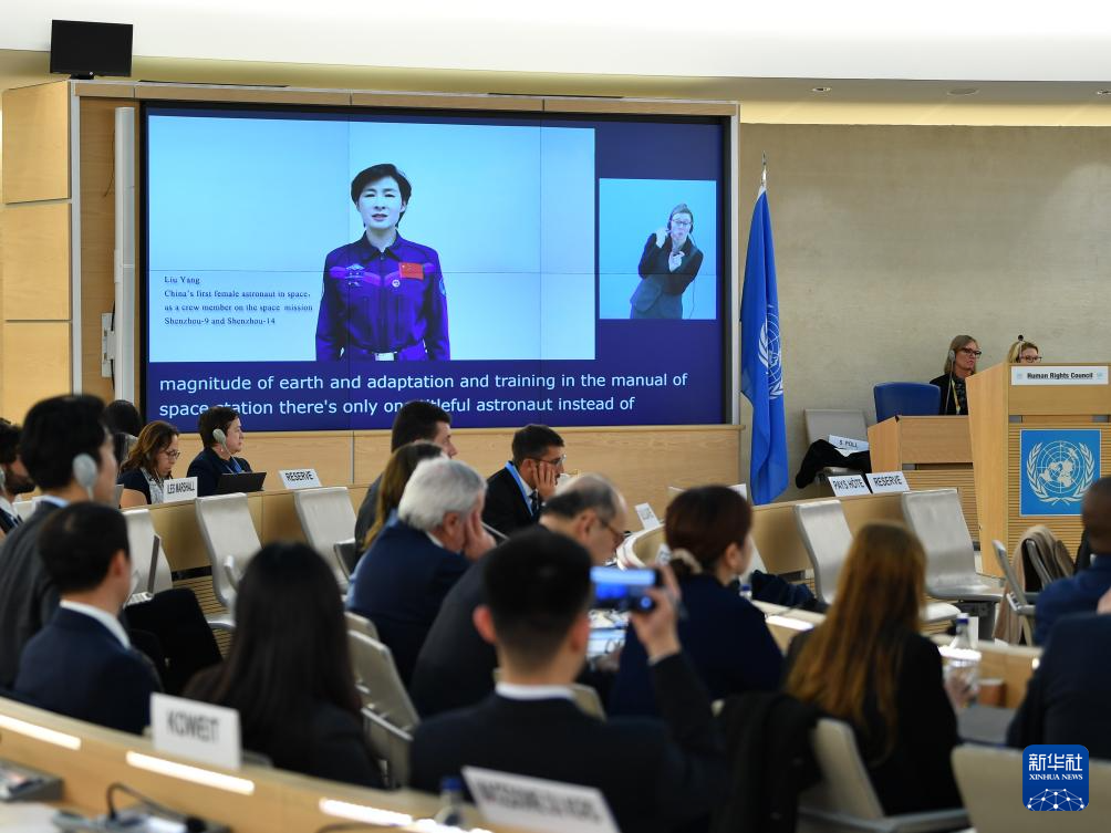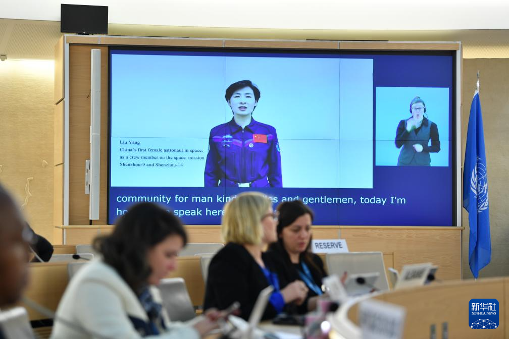 这是2月24日在瑞士日内瓦万国宫拍摄的中国航天员刘洋在联合国人权理事会第58届会议“《北京宣言》和《行动纲领》三十周年”高级别会议上以视频方式做主旨发言。新华社记者 连漪 摄