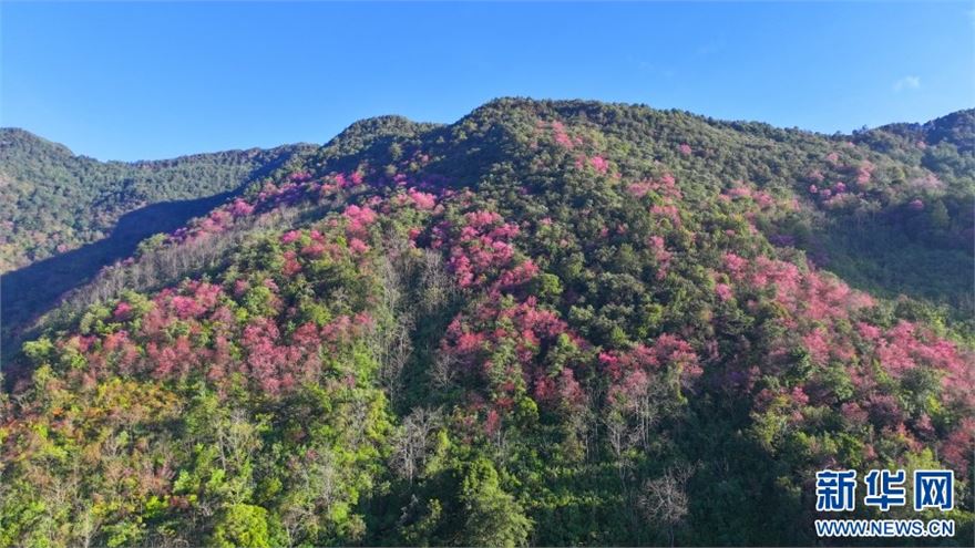 近日,云南省保山市施甸县善洲林场的数万棵野生冬樱花竞相绽放。放眼望去,冬樱花盛开于青山间,鸟儿时而停歇于冬樱花枝头,时而振翅高飞于云雾之中。一幅“雾锁冬樱鸟啼幽,云遮艳蕊舞霓裳”的画卷浑然天成,美不胜收。