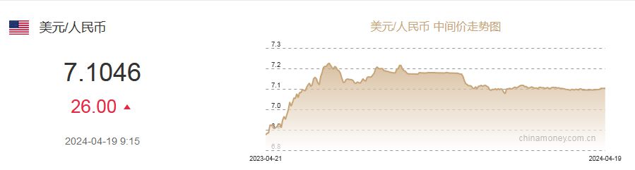 中新网4月19日电 中国人民银行授权中国外汇交易中心公布,2024年4月19日银行间外汇市场人民币汇率中间价为:1美元对人民币7.1046元,下调26个基点。