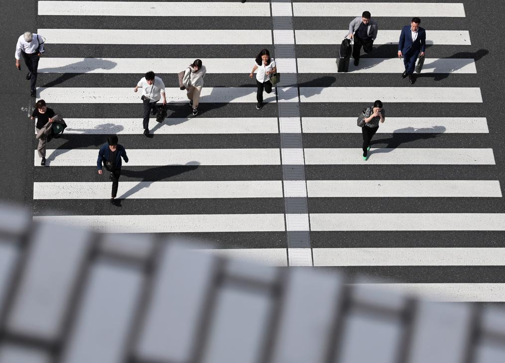 5月15日,在日本东京,行人通过东京站附近的一处人行横道。新华社记者贾浩成摄