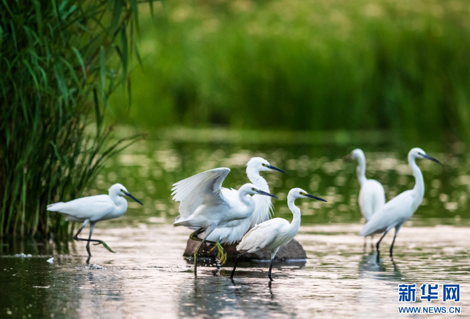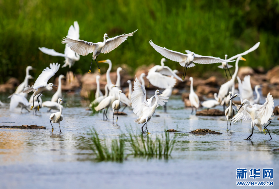 成群的白鹭在沭河郯城段嬉戏。新华网发(刘宗强 摄)