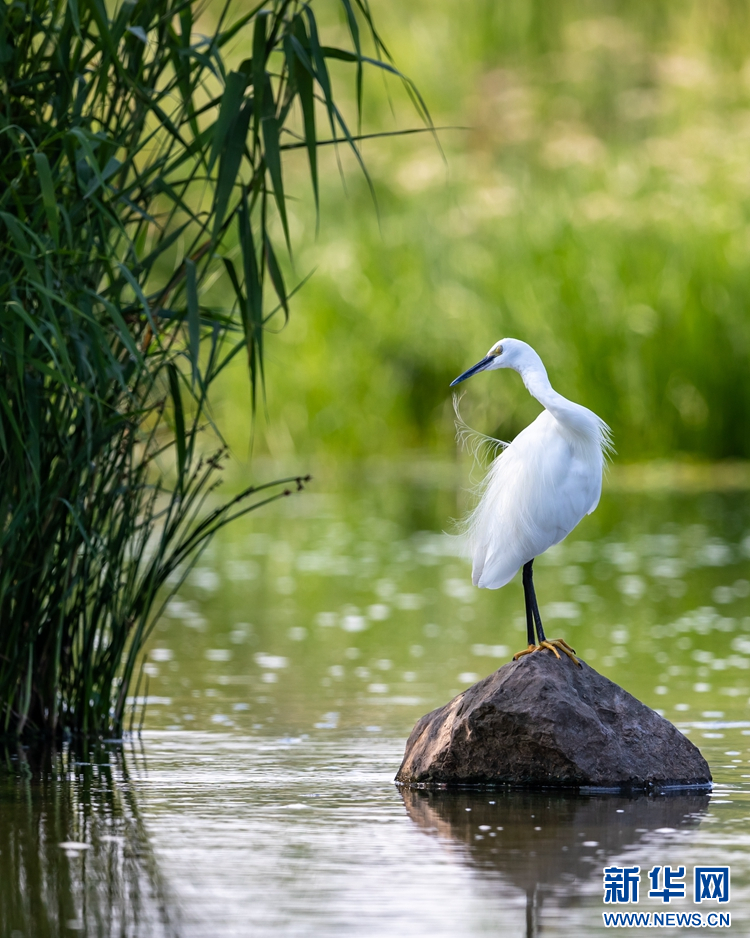 沭河郯城段河畔,一只白鹭在梳理羽毛。新华网发(刘宗强 摄)