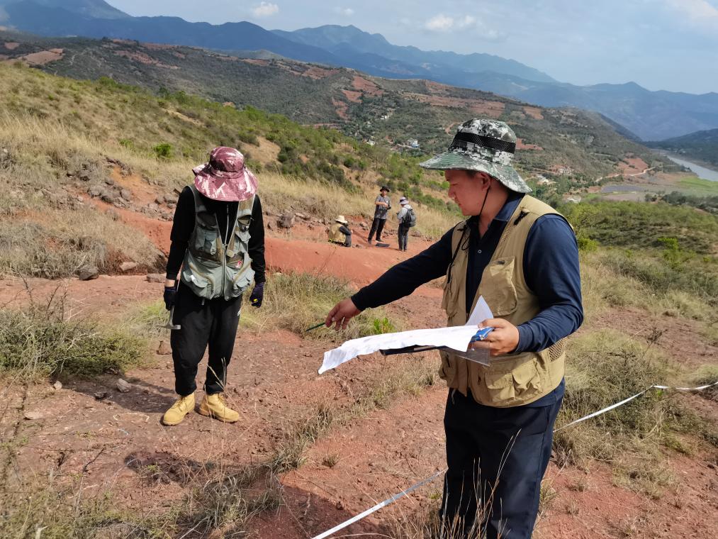 工作人员在现场测量恐龙足迹化石。(禄丰市融媒体中心供图)