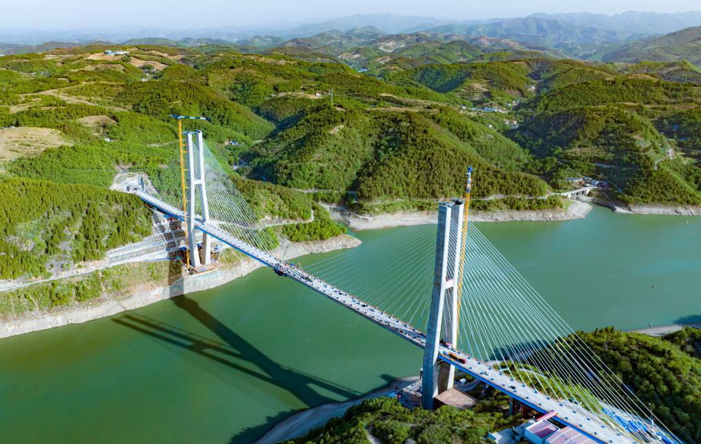 汉江特大桥位于湖北省十堰市郧阳区境内,是西十高铁全线控制性工程。该桥全长917.45米,其中两座H形主塔高达186.5米,全桥共设置80对斜拉索,采用空间双索面体系呈扇形布置。