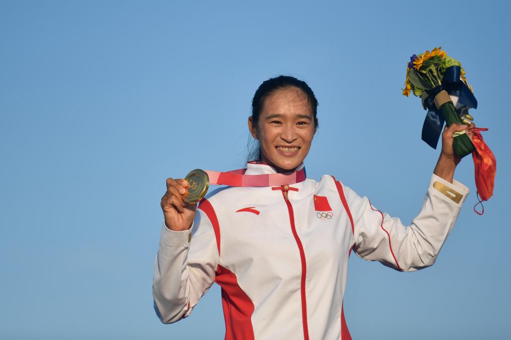 2021年7月31日,中国选手卢云秀在领奖台上。当日,在东京奥运会女子帆板RS:X级比赛中,中国选手卢云秀获得冠军。新华社记者 黄宗治 摄
