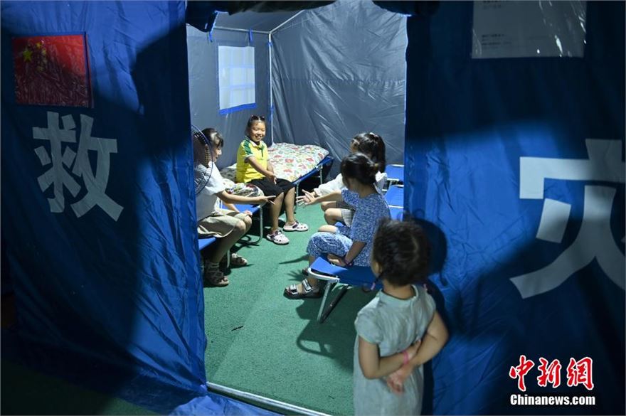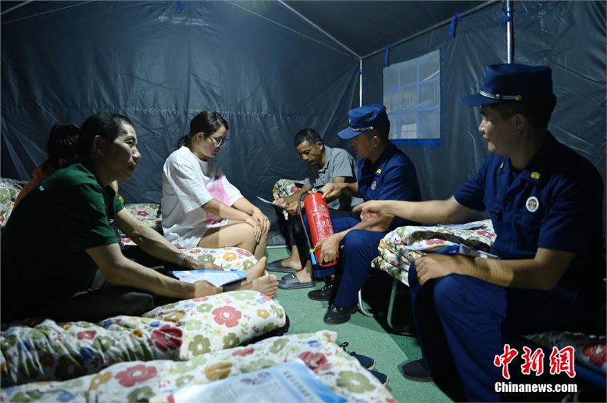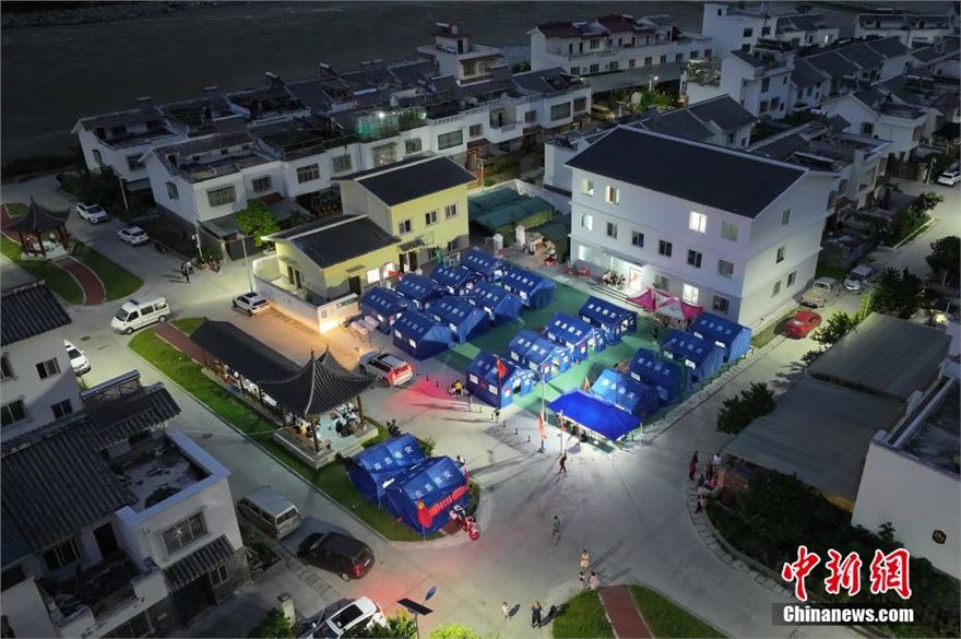 8月5日晚,四川康定,临时安置点一帐篷外村民围坐一起聊天。夜幕下的四川省康定市姑咱镇郎鼓村,“8·03”山洪泥石流灾害临时安置点内灯火通明,帐篷内外村民围坐一起,或看手机信息,或为手机充电和聊天。