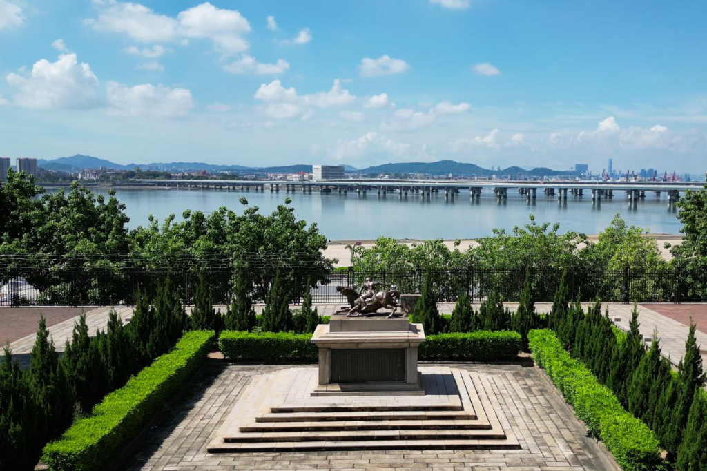 ↑福建省厦门集美中学李林园内,面海而立的李林雕像。(无人机照片)钟炜俊摄