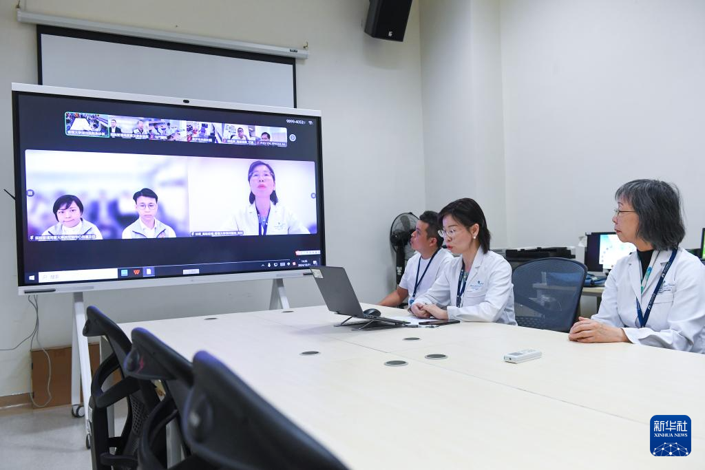 10月31日,在香港大学深圳医院,粤港两地政府和医疗机构等通过电视电话会议沟通转运事宜。新华社记者 毛思倩 摄