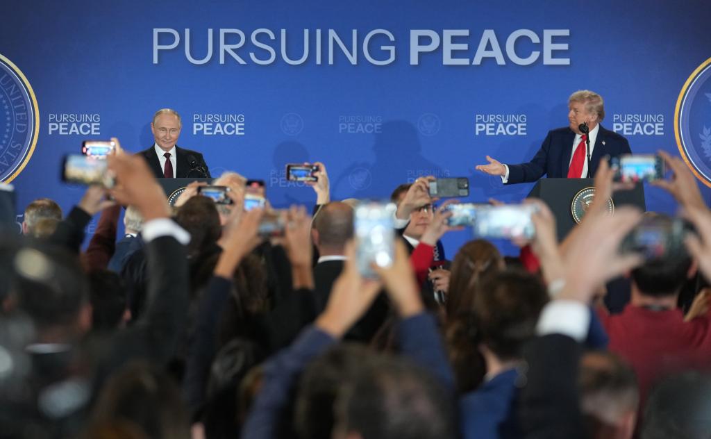 8月15日,美国总统特朗普(右)与俄罗斯总统普京在美国阿拉斯加州安克雷奇市埃尔门多夫-理查森联合军事基地举行会晤后共同出席联合记者会。新华社记者吴晓凌摄