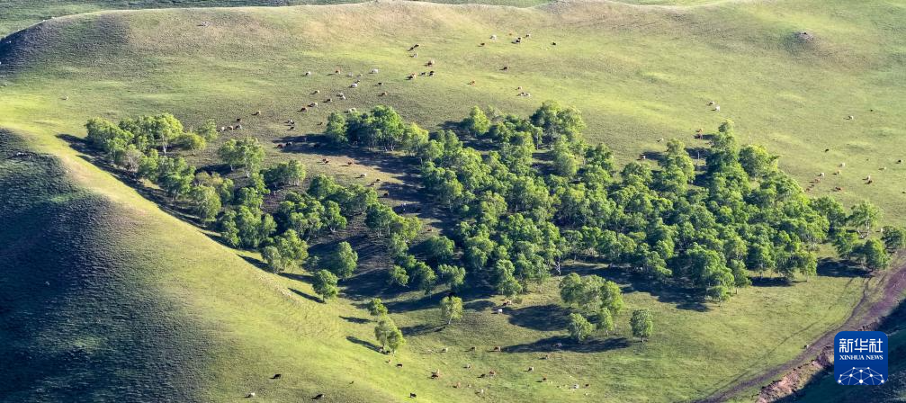 6月5日,牛群在内蒙古大青山国家级自然保护区吃草(无人机照片)。