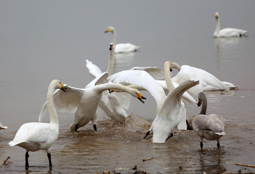 这是11月24日,在三门峡市天鹅湾,天鹅在水面上打闹嬉戏。新华社发