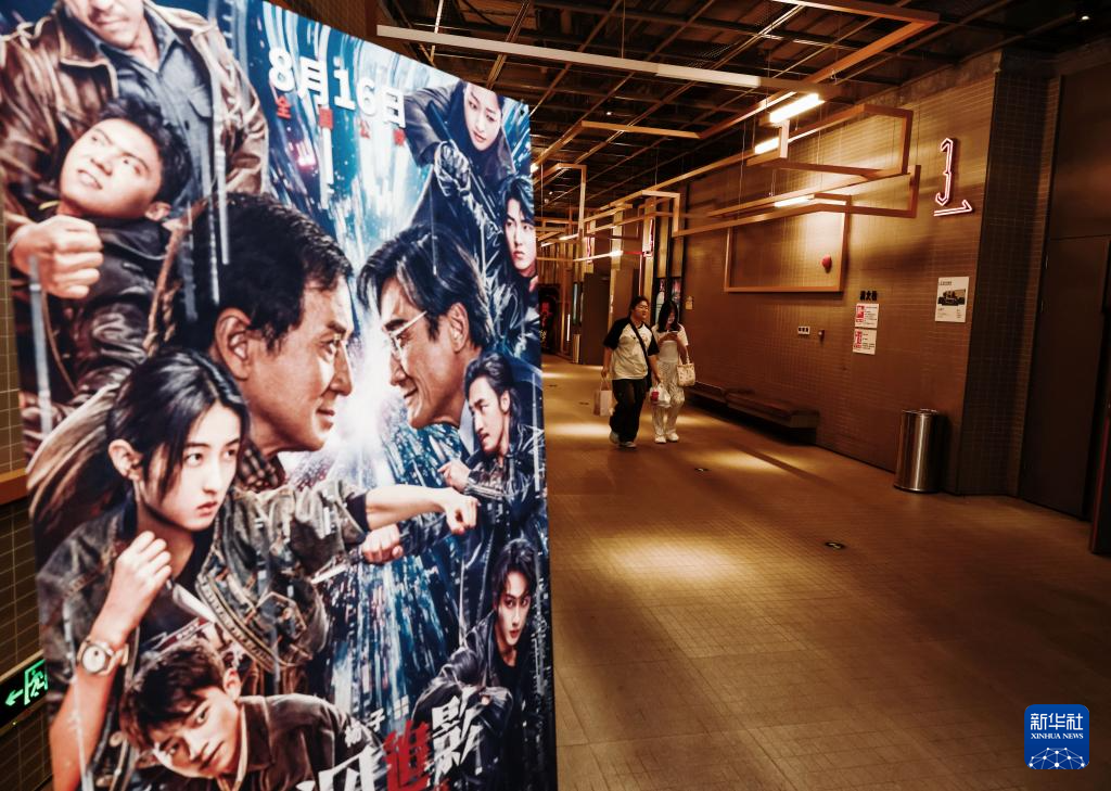 8月17日,观众从山东省青州市一家影城的暑期档电影宣传海报旁走过。