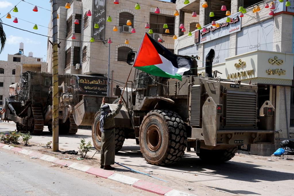 8月22日,在约旦河西岸北部的图勒凯尔姆,一名男子手持巴勒斯坦国旗站在以军车辆前。据巴勒斯坦通讯社22日报道,以色列军队当天袭击了位于约旦河西岸北部的图勒凯尔姆难民营,造成3人死亡。新华社发(艾曼·诺巴尼摄)