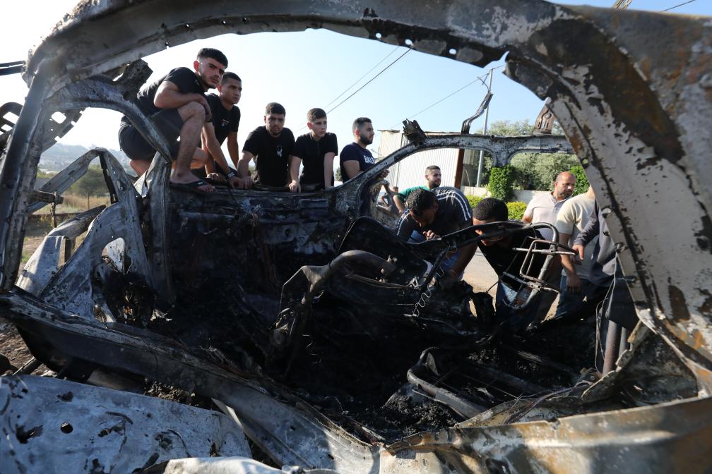 8月6日,在约旦河西岸城市杰宁,人们查看在以军袭击中损坏的车辆。巴勒斯坦卫生部6日发表声明说,以色列军队5日晚至6日在约旦河西岸多地开展行动,导致10名巴勒斯坦人死亡。新华社发(艾曼·诺巴尼摄)