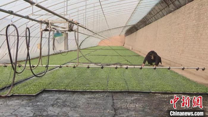 陈泓志在大棚查看蔬菜苗的透水情况。贺兰县委宣传部供图