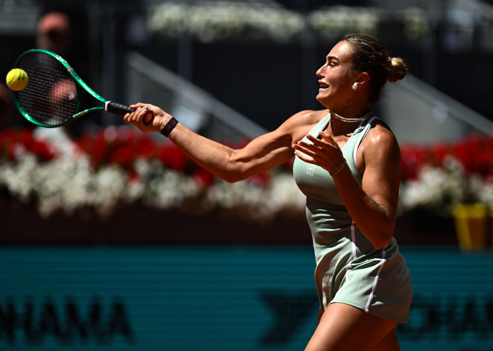 4月27日,白俄罗斯选手萨巴伦卡在比赛中回球。新华社记者 程敏 摄