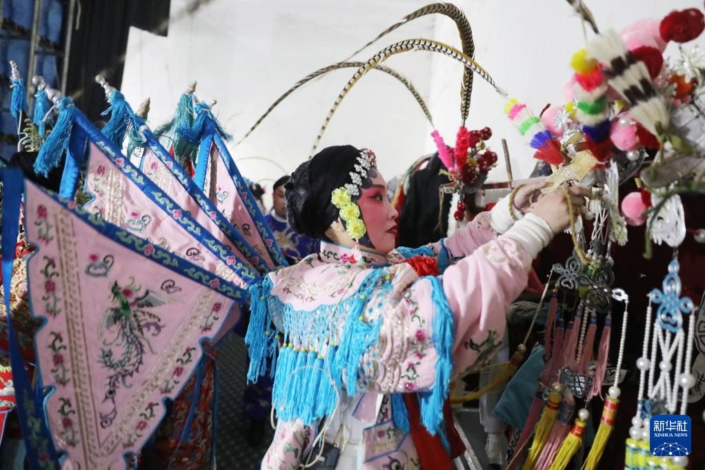 3月7日,演员在河南省焦作市温县武德镇村文化中心候场时整理道具。新华社发(徐宏星摄)