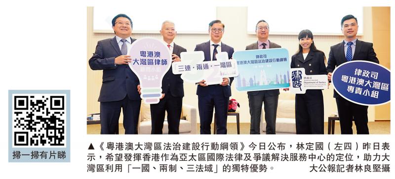 图:《粤港澳大湾区法治建设行动纲领》今日公布,林定国(左四)昨日表示,希望发挥香港作为亚太区国际法律及争议解决服务中心的定位,助力大湾区利用“一国、两制、三法域”的独特优势。 大公报记者林良坚摄