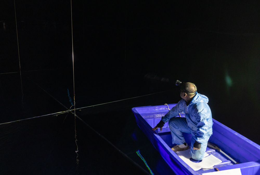 在位于四川省稻城县海子山的高海拔宇宙线观测站“拉索”水切伦科夫探测器阵列水池,科研人员坐船更换实验设备(2023年4月21日摄)。新华社记者 金立旺 摄