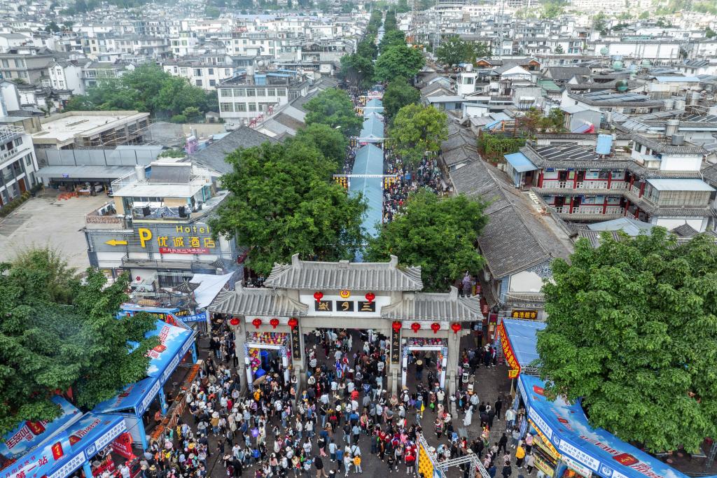 人们参加三月街民族节(4月23日摄,无人机照片)。新华社发(赵子忠 摄)