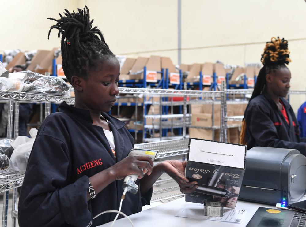 2023年11月10日,在肯尼亚姆洛隆戈,Kilimall员工在仓库内工作。Kilimall是第一家在非洲设立海外仓并实现100%在线支付的中国电商平台,是当地民众喜爱的购物网站之一。新华社记者 李亚辉 摄