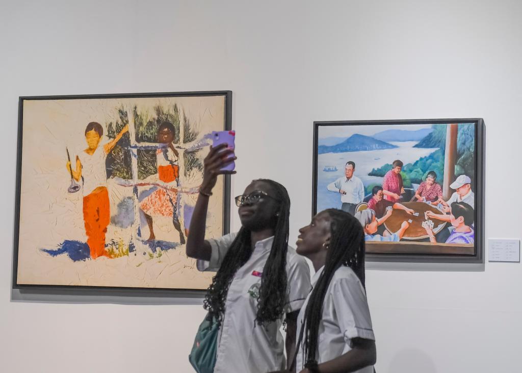 2023年5月12日,游客在塞内加尔首都达喀尔的黑人文明博物馆与展出画作合影。“隔洋相看——非洲画家笔下的中国”画展5月12日在这里开幕。新华社记者 李亚辉 摄