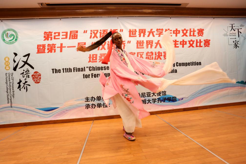 2024年5月22日,在坦桑尼亚达累斯萨拉姆,参赛者在“汉语桥”世界大学生中文比赛坦桑尼亚赛区决赛上展示才艺。 新华社发(赫尔曼·埃马纽埃尔摄)